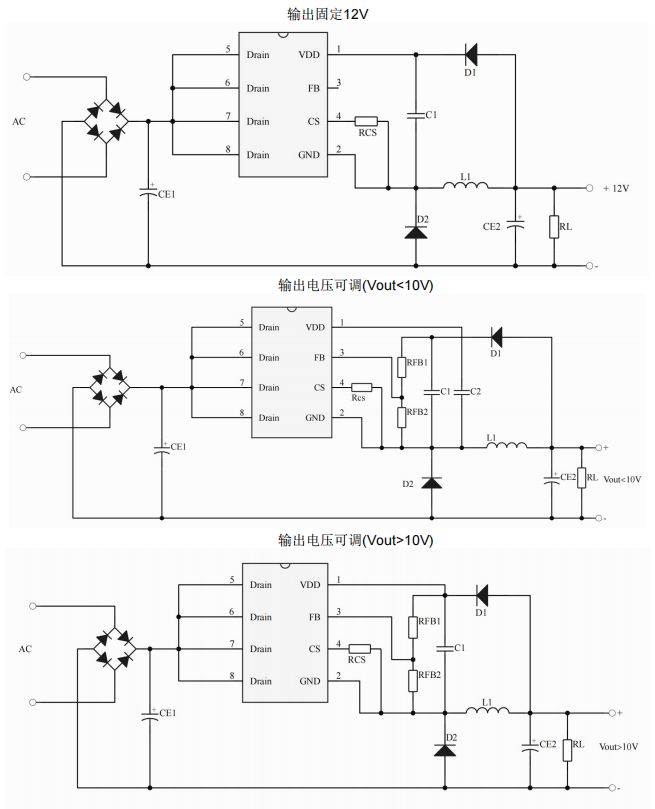 •主要特點:集成 650V 高壓啟動電路;多模式控制、無異音工作;支持降壓和升降壓拓撲;默認 12V 輸出( FB 腳懸空);待機功耗低于 50mW;良好的線性調整率和負載調整率;集成軟啟動電路;內部保護功能 :過載保護 (OLP);逐周期電流限制 (OCP);輸出過壓保護 (OVP)Ø VDD 過壓、欠壓和電壓箝位保護