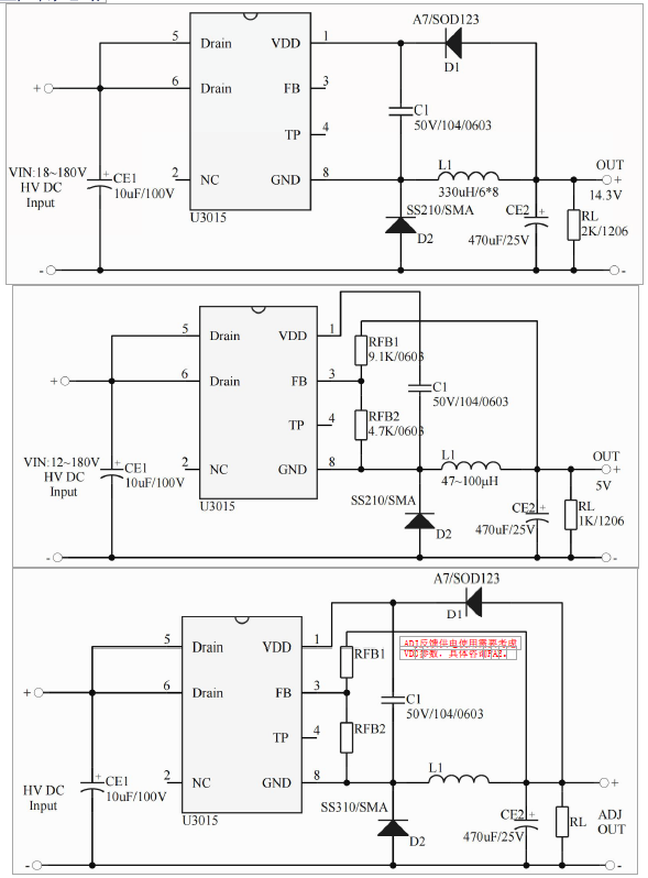 •主要特點:WN: 12~180V(OUT:ADJ);集成 2.5A 180V MOS;集成 200V 高壓啟動電路;多模式控制、無異音工作;支持降壓和升降壓拓?fù)?默認(rèn)14.3V 輸出(FB 腳懸空);待機功耗低于 50mw;良好的線性調(diào)整率和負(fù)載調(diào)整率;集成軟啟動電路;內(nèi)部保護功能:過載保護(OLP);逐周期電流限制(OCP);輸出過壓保護(OVP);VDD 過壓、欠壓和電壓箝位保護。