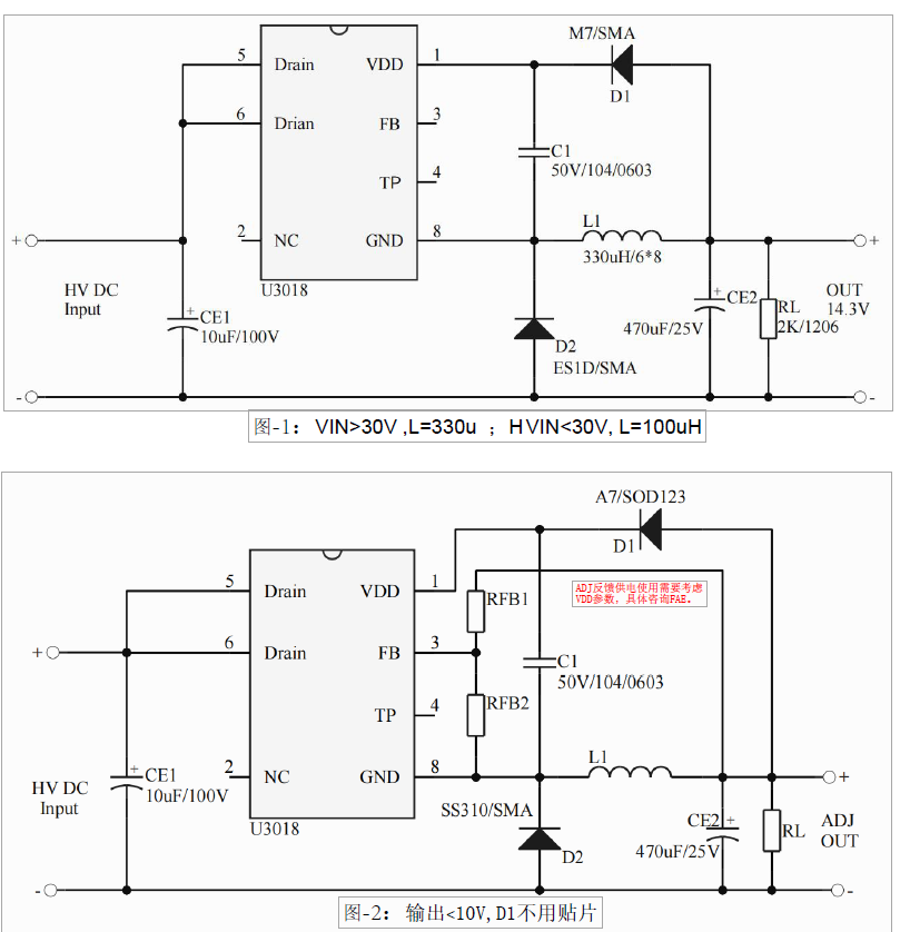 •主要特點:VIN: 18~180V(OUT: 14.3V);集成 2.5A 180V MOS;集成 200V 高壓啟動電路;多模式控制、無異音工作;支持降壓和升降壓拓撲;默認14.3V 輸出;待機功耗低于 50mw;良好的線性調整率和負載調整率;集成軟啟動電路;內部保護功能:過載保護(OLP);逐周期電流限制(OCP);輸出過壓保護(OVP);VDD 過壓、欠壓和電壓箱位保護